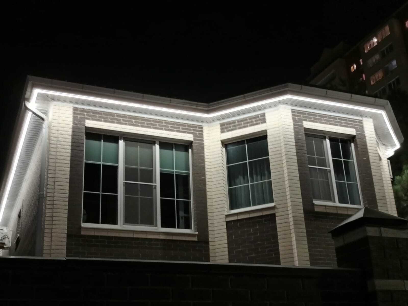 - Напряжение: для фасадов большой протяженности лучше использовать 24V (меньше падение яркости в конце линии) или 220V (позволяет подключать до 50 метров одним куском, но требует предельной осторожности с изоляцией).