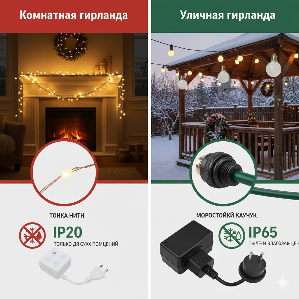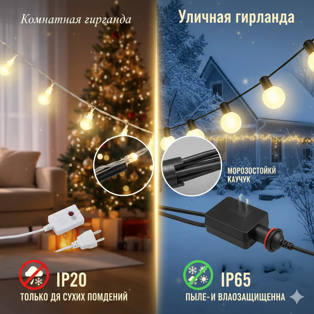 Важно: Использование комнатной гирлянды на улице — это риск пожара и поражения электрическим током. Не экономьте на безопасности!