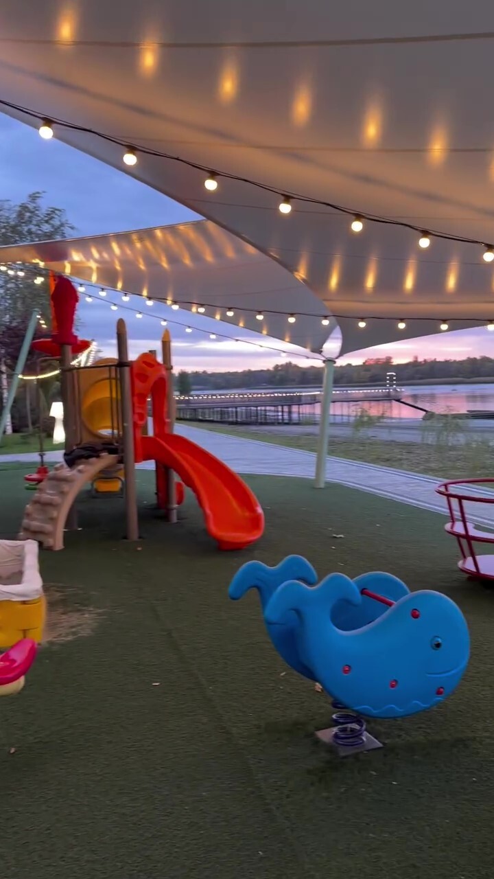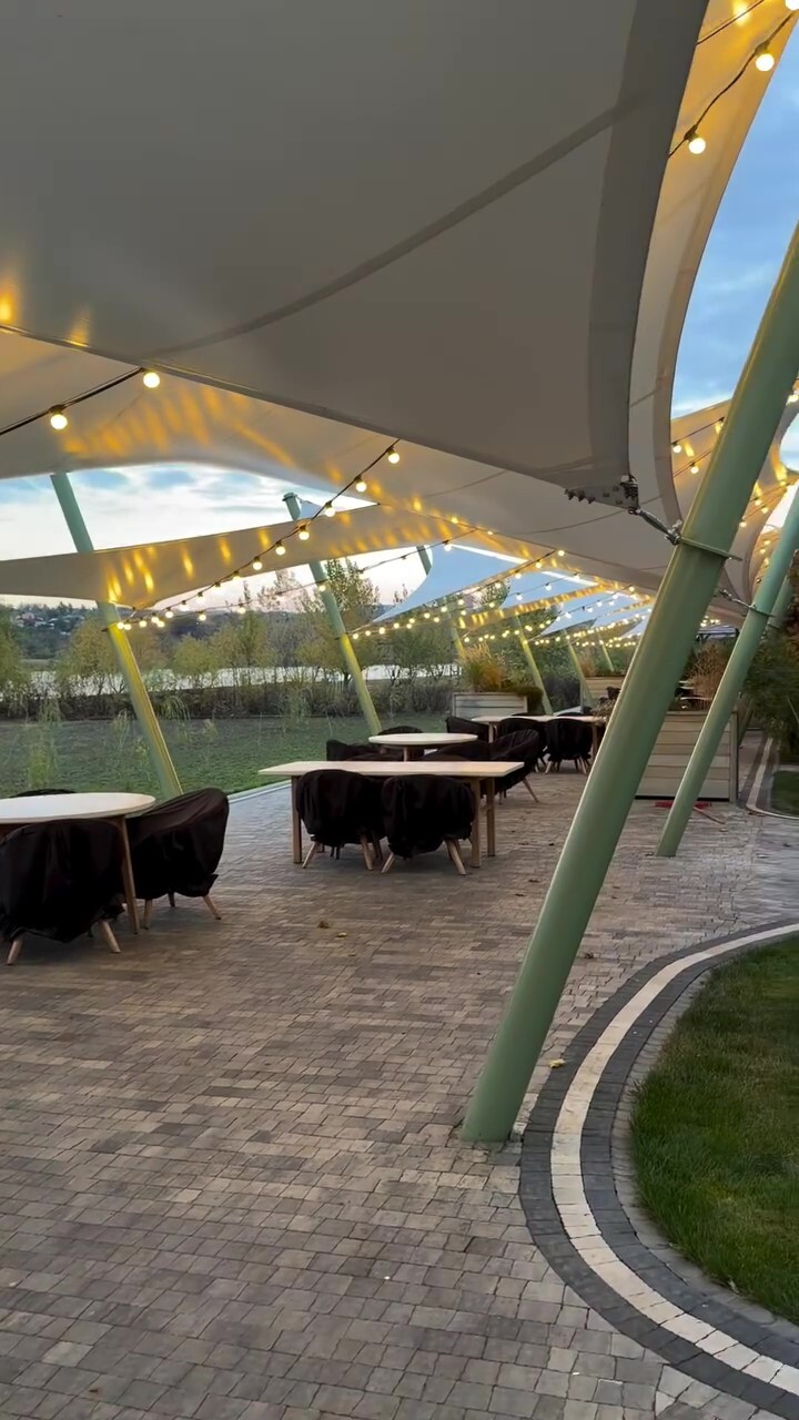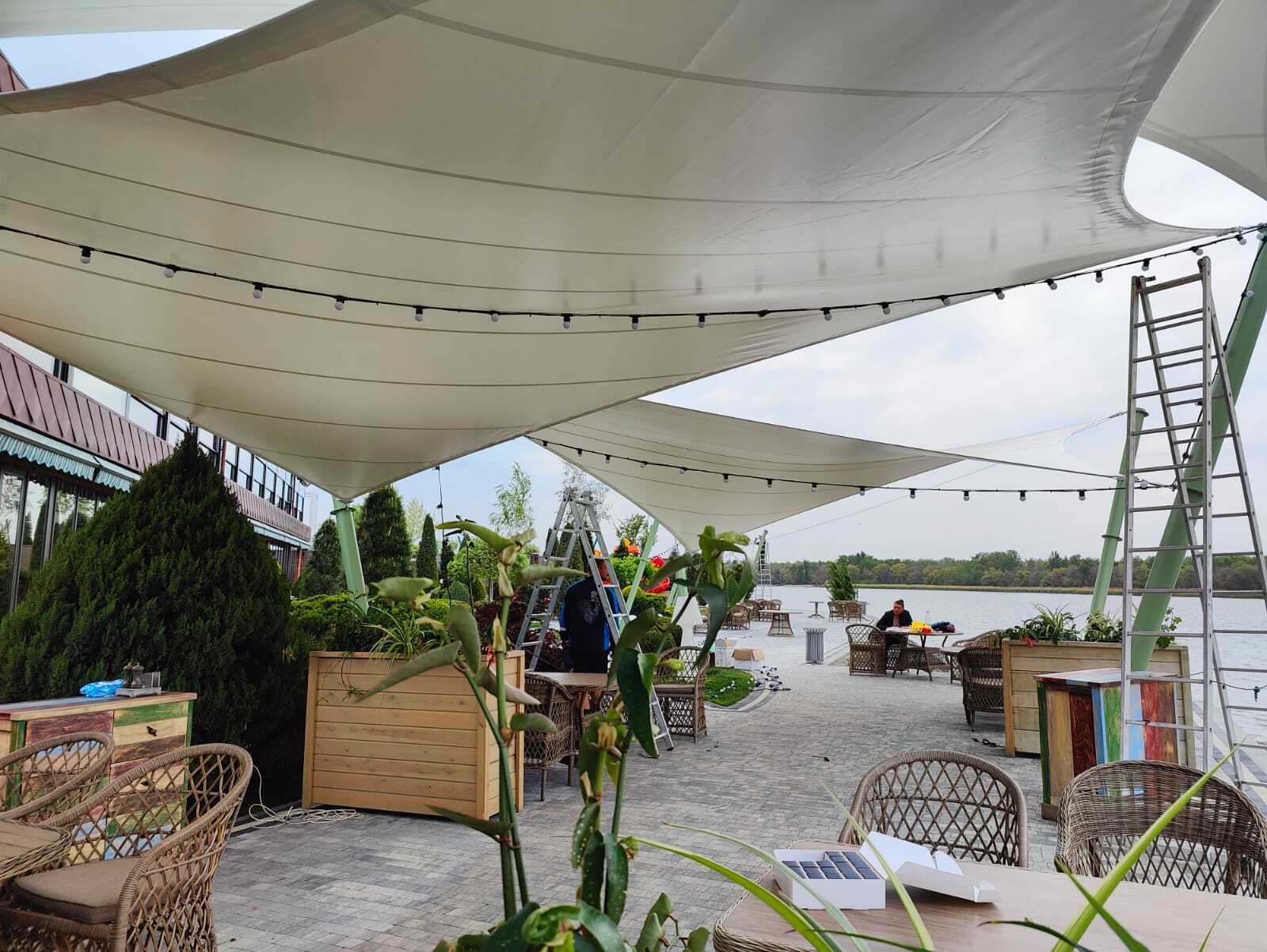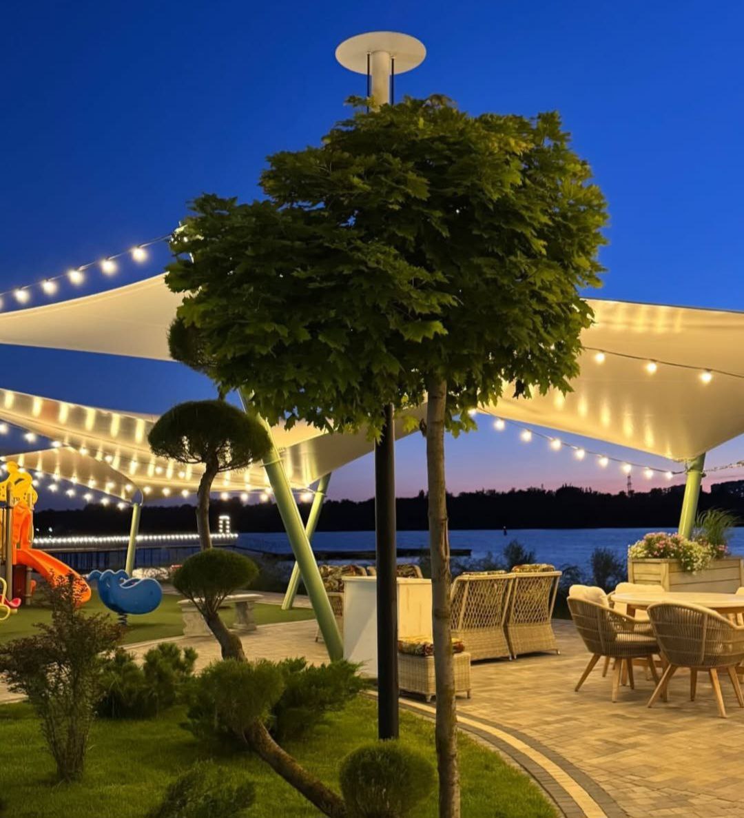 Здесь мы украшали паруса и пешеходную зону, создавая праздничную и уютную атмосферу для всех посетителей. Для этого мы использовали специальные гирлянды, которые надёжно крепятся на предварительно натянутом металлическом тросе.