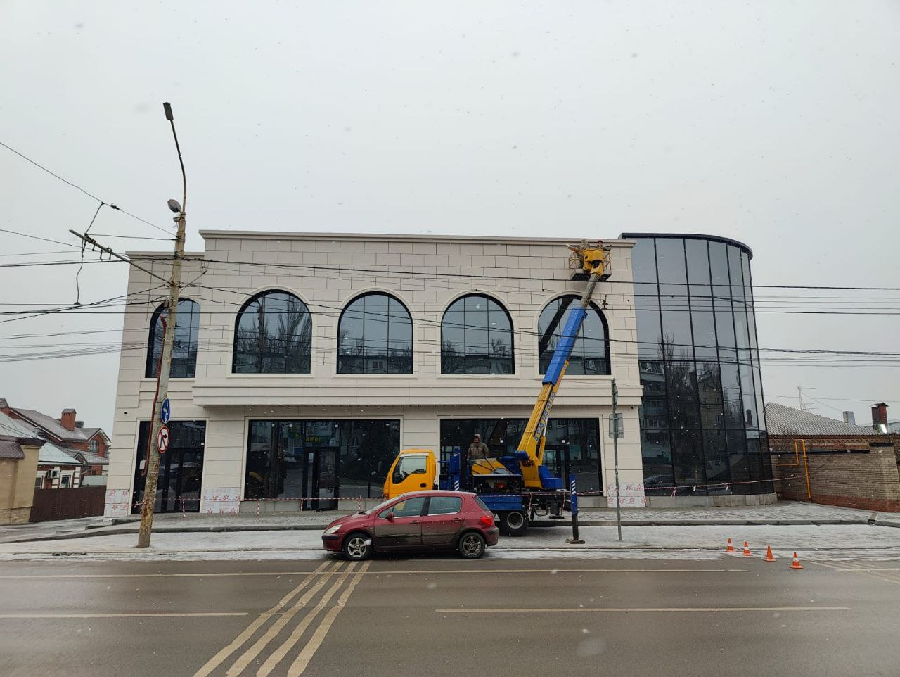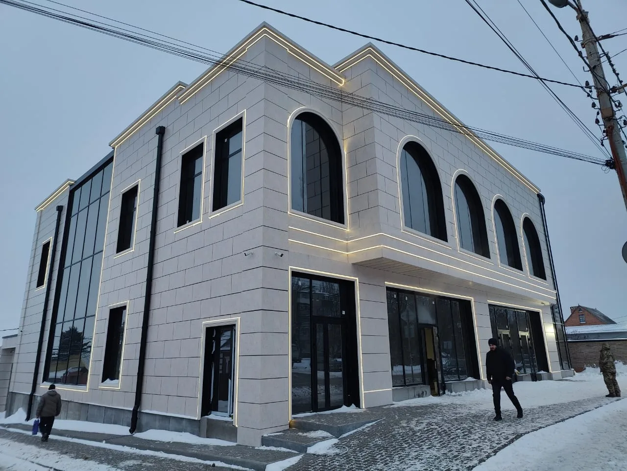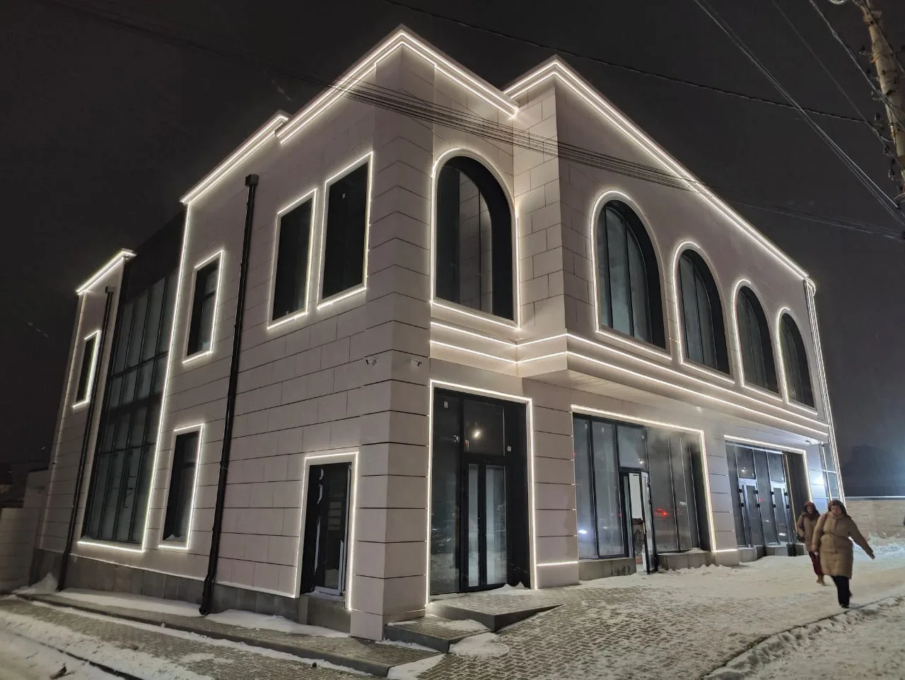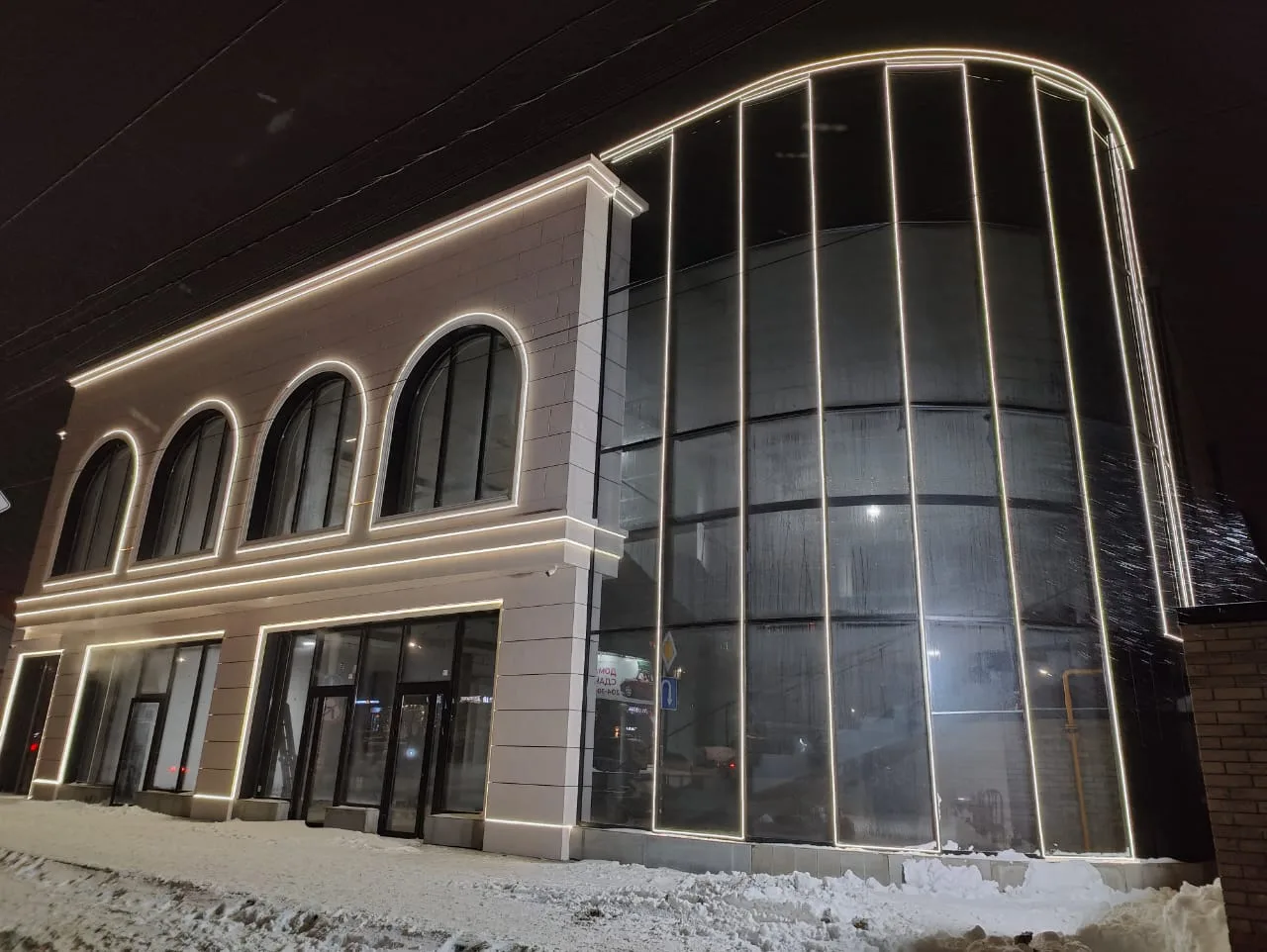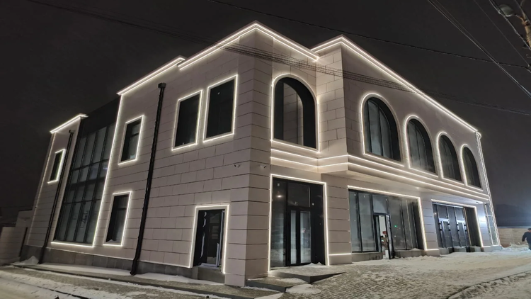 - Геометрия: Гибкость материала позволила нам идеально подчеркнуть контуры фасада, создав эффект «парящих» линий.