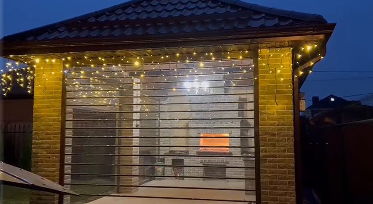 В этом проекте мы сделали ставку на классику — «теплое» золото. Светодиодная бахрома по периметру крыши и беседки создали благородный и праздничный вид.